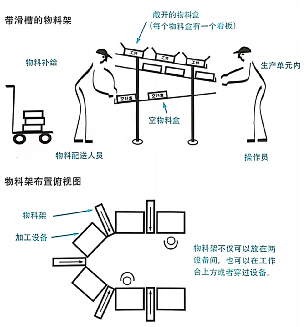 12. 补充物料时,不能影响正常的单元生产。进行配送前,应先把物料装入一定的容器,然后通过一个斜放的料架滑槽,利用重力自动滑至单元中。操作员在拿取工件后,再把空容器放入反向的滑槽,自动滑出生产单元。这样,物料人员就可以取走空容器,以补充新的物料。