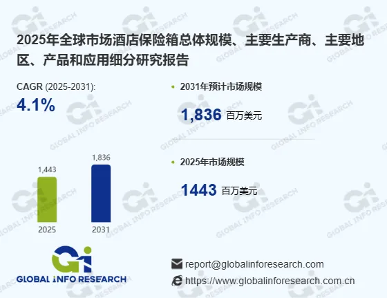 酒店保险箱市场正保持着持续向上的发展态势。据GIR (Global Info Research)调研数据显示,按收入计算,2024年全球酒店保险箱市场规模约为13.90亿美元,预计到2031年,这一数字将增长至18.36亿美元。在2025年至2031年的预测期内,市场年复合增长率(CAGR)将达到4.1%,展现出该品类在全球酒店设备市场中的稳定发展潜力。