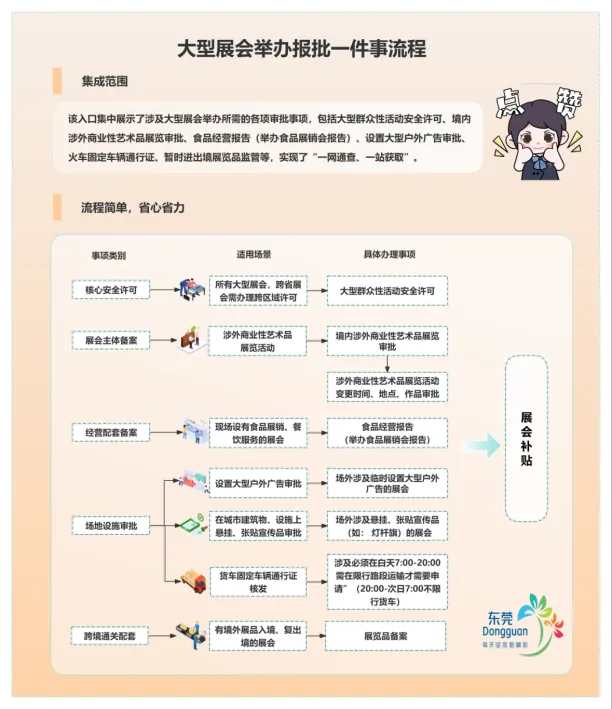 作为国际科创制造强市,东莞积极打造“制造美学之城”产业名片,立足“制造+会展”深度融合的特色发展路径,紧扣企业办展“找入口、查事项、办审批”核心需求,深入贯彻落实国务院“高效办成一件事”改革要求,由市政务和数据局联合市商务局等部门,正式推出大型展会举办报批“一件事”一站式线上服务专区,让企业办展审批更便捷、更高效。