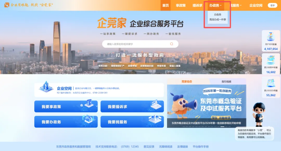 作为东莞本土惠企服务特色平台,“企莞家”同步接入展会报批相关服务,实现办展事项办理与惠企政策申报一站式衔接,操作路径:打开“企莞家”平台,使用企业账号登录;在首页点击“办政务”菜单,选择“高效办成一件事”分类,找到“大型展会举办报批一件事”入口,点击进入专区。