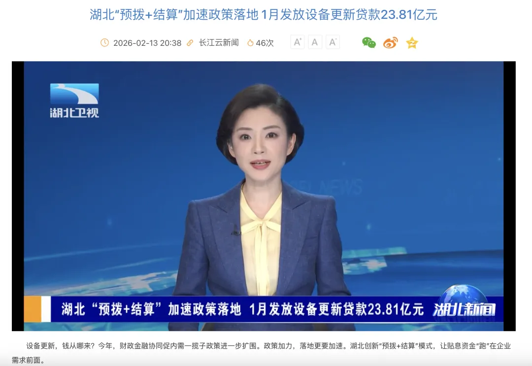湖北省采取“预拨+结算” 模式,让贴息资金“跑”在企业需求前面。2026年1月,全省新增发放设备更新贷款23.81亿元,支持108个项目进行设备“焕新”升级。企业在申请贷款时,直接按贴息后的利率计收利息,无需先付全款再等补贴,办理环节整体压缩超50%。2025年,全国设备更新改造再贷款贴息中央资金规模中,湖北位居第一。(数据来源:湖北省财政厅)
