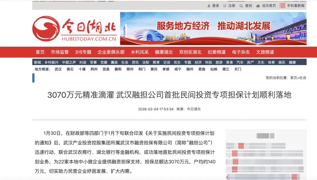 1月30日,武汉市融资担保有限公司联合武汉农商行、湖北银行等,落地首批民间投资专项担保计划业务,为22家本地中小微企业提供融资担保总额3070万元,户均约140万元。1月22日,湖北省科担公司落地全省首笔民间投资专项担保业务,为武汉某科技公司提供150万元、为期2年的融资担保支持。湖北省科担公司力争到2026年底,专项计划规模突破20亿元。