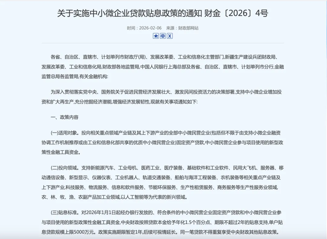 根据财政部等五部门联合发布的《关于实施中小微企业贷款贴息政策的通知》(财金〔2026〕4号):