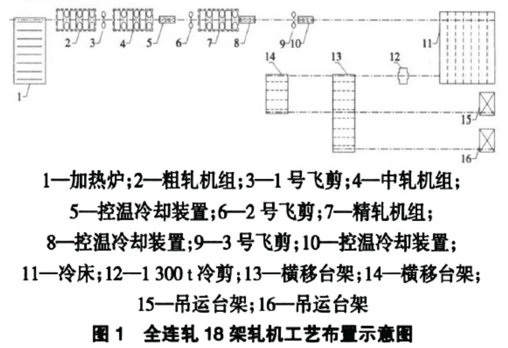 摘要:首钢长治钢铁公司轧钢厂现有棒材生产线设计年产100万t,其中Φ12~Φ22mm规格棒材采用切分工艺生产。在棒材生产线现有轧机及冷床工艺不变的条件下,提出在现有精轧机与冷床之间增加双线各6架轧机及高速上钢装置,Φ12~Φ22mm规格采用两切分+双高棒模式,Φ25~Φ40mm规格仍采用现有单线轧制工艺,从而实现Φ12~Φ22mm规格产品的产量和质量双提升。棒材(钢筋)生产采用切分技术后,中小规格产品产量得到大幅度提升。首钢长治钢铁公司(全文简称 “首钢长钢”)轧钢厂原连轧产线(21架轧机,1986年从意大利引进的二手设备)最早于2002年采用二切分技术生产Φ12mm轧带肋钢筋,是国内较早成功自主开发切分技术的厂家,采用切分技术后,其产能由设计年产18万t提升至36万t以上[ 1] 。2018年首钢 长钢成功将双高线的北线改造成高速棒材及高线的复合生产线,直条Φ12 mm钢筋采用高速棒材模式生产,经实际运行,发现高速棒材比多线切分生产小规格热轧带肋钢筋有明显优势:一是高速棒材的精轧机采用碳化钨辊环,产品外观表面质量比多线切分优良;二是高速棒材生产的产品尺寸精度高,成品负偏差控制精准,相对于多线切分,其成材率可提高0.6个百分点;三是高速棒材比多线切分工艺更稳定,工艺跑钢故障少。鉴于高速棒材生产钢筋中小规格产品的优势,近4年内,国内新上钢筋产线大多数采用高速棒材模式。此外,为了突破单线高棒产量相比多线切分低的劣势,近2年内国内新建少数产线出现二切分+双线高棒的工艺布置模式,成功将切分和高速棒 的优点结合起来,产量可达150万t以上。首钢长钢现有的设计年产100万t棒材产线于2011年建成投 产,经多年优化改进,目前Φ12~Φ14mm钢筋采用四切分工艺、Φ16~Φ18mm钢筋采用三切分工艺、Φ20~Φ22mm钢筋采用二切分工艺,Φ25mm以上产 品采用单线生产工艺,最高年产达到135万t。为发挥该产线的能力和节约投资,可尝试将产线改造成二切分+双线高棒的工艺布置模式,使其具备年产160万t的能力。该棒材生产线由18架轧机组成,分为粗轧(Φ550mm×4+Φ450 mm×2)、中轧(Φ450mm×4+Φ350mm×2)及精轧(Φ350mm×6)三个机组,精轧机组由6架轧机组成,其中16号和18号机架为平立可转换轧机,满足切分轧制,中轧后、精轧后、3号倍尺剪后均配置控冷装置。现有工艺布置简图如图 1所示。