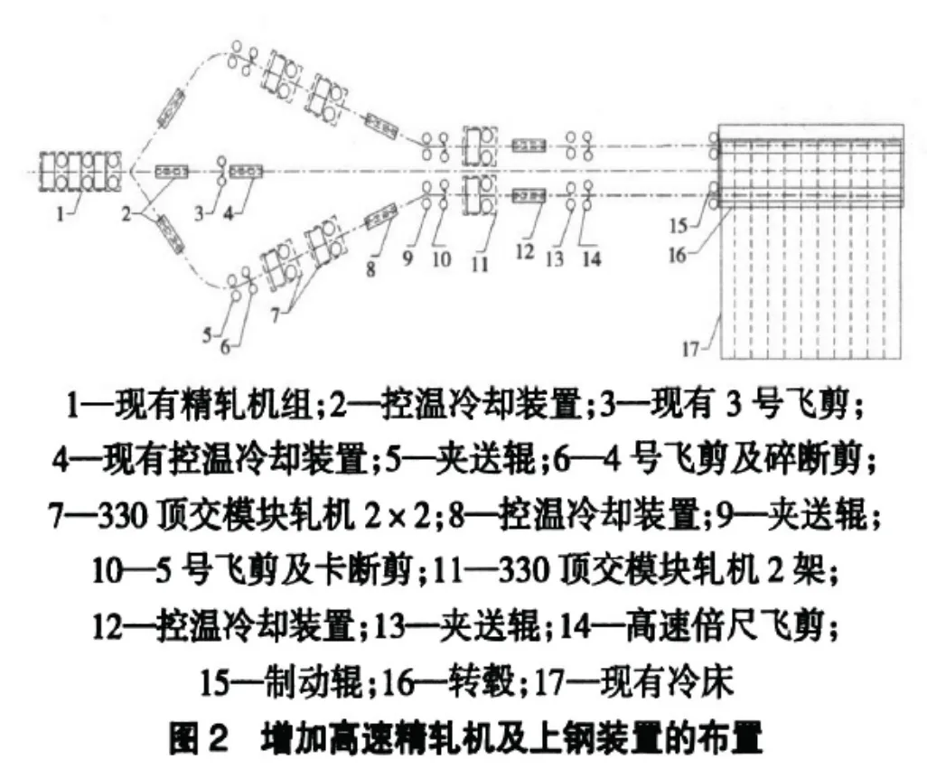 高速精轧改造方案是在现有的精轧机组和冷床之间的轧制线两侧布置2套高速轧制设备,每套设备包括控温水冷装置、夹送辊、4号飞剪及碎断剪、高棒精轧机(330顶交模块轧机2×2)、控温水冷装置、夹送辊、5号飞剪及卡断剪、减径机架(330顶交模块轧机2架)、成品后控温水冷装置、夹送辊及高速飞剪、制动辊、转毂,工艺布置如下页图2所示。6架高速轧机产品范围为Φ12~Φ22mm,轧制速度最大为38m/s。大规格Φ25~Φ40mm棒材采用现有的辊道和裙板上冷床。轧制中小规格时轧件在现有的6架精轧机上切分为两线来给后面高速轧机供料。2.2改造方案二