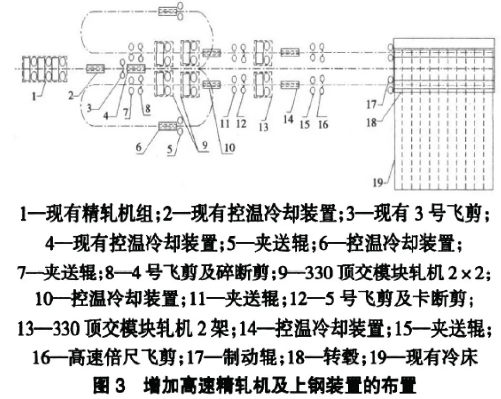 高速精轧改造方案是在现有的精轧机组和冷床之间的轧制线两侧布置2套高速轧制设备,每套设备包括夹送辊、控温水冷装置、4号飞剪及碎断剪、高棒精轧机(330顶交模块轧机2×2)、控温冷却装置、夹送辊、5号飞剪及卡断剪、减径机架(330顶交模块轧机2架)、成品后控温水冷装置、夹送辊及高速飞剪、制动辊、转毂,工艺布置如图3所示。6架高速轧机产品范围为Φ12~Φ22mm,轧制速度最大为38m/s。大规格Φ25~Φ40mm棒材走现有的辊道和裙板上冷床。轧制中小规格时轧件在现有的6架精轧机上切分为两线经大回转通道给后面高速轧机供料。