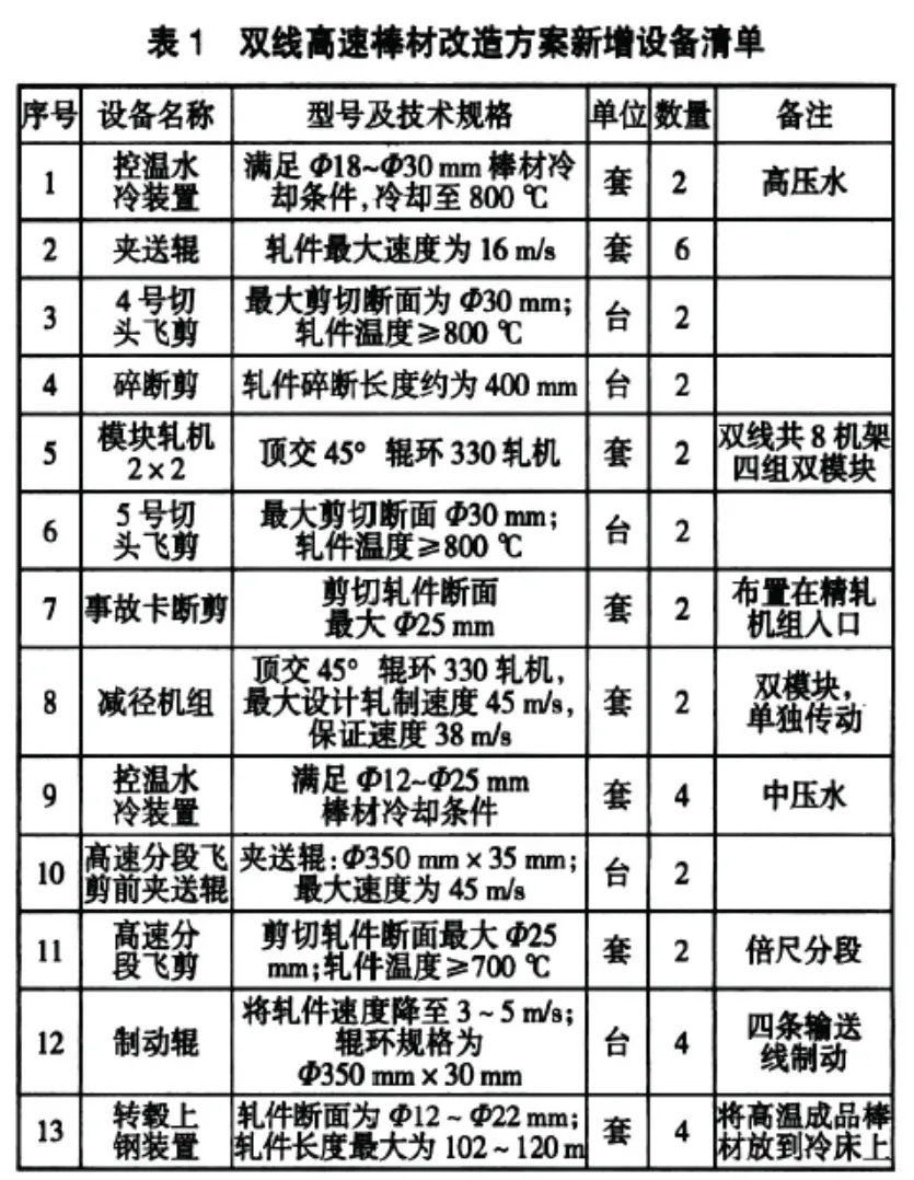 从理论上分析,改造方案一及改造方案二均能实现二切分+双线高棒改造目标,但由于该棒材现有工艺布置的精轧机末架到冷床距离仅为112.5m,基于考虑低温轧制和获得更好的成品性能以及改造投资尽可能少的情况,方案二更适合目前的改造条件,因为通过回转大通道,现有精轧机末架到双模块高速轧机的距离比方案一增加了至少40m左右,从而有更多的空间用于布置最后一组顶交模块轧机、高速 倍尺飞剪以及制动辊。此外,经初步了解,新建切分+双高棒模式产线,其切分轧机到冷床的距离基本在200m以上。