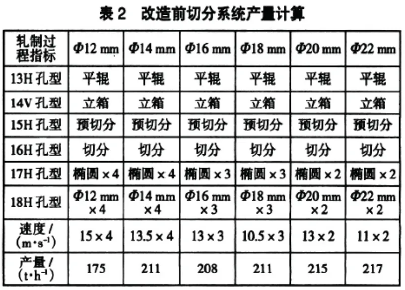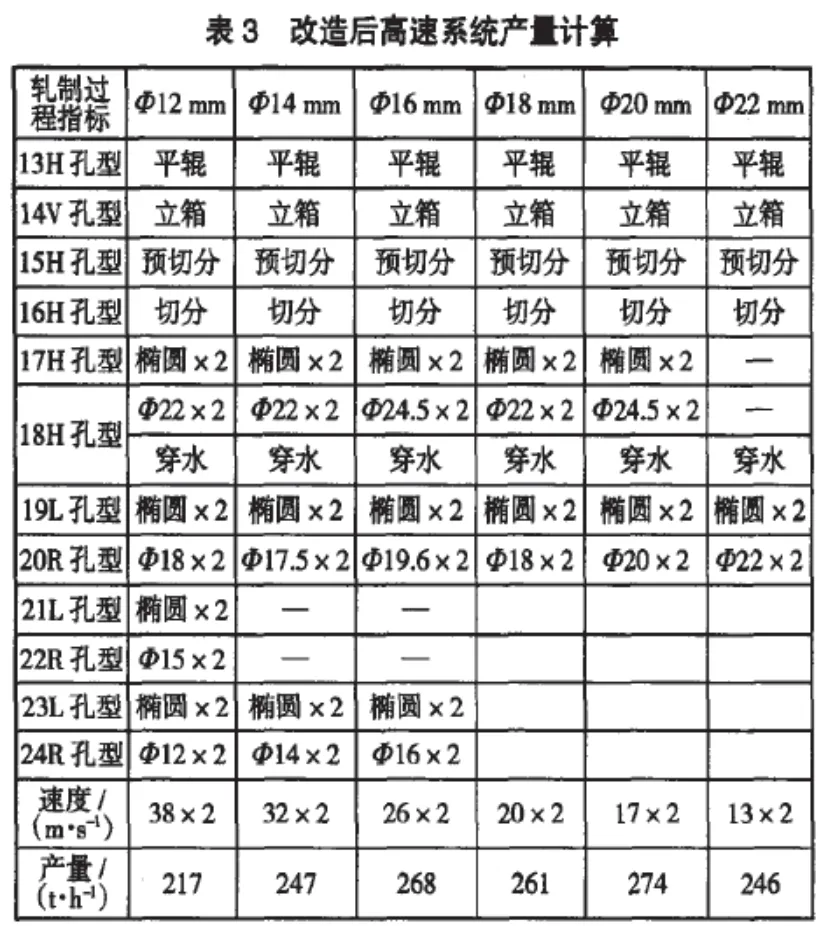 以现有150mm×150mm×12000mm连铸坯计算产量,改造前后的孔型系统分别列于表2和表3中。
