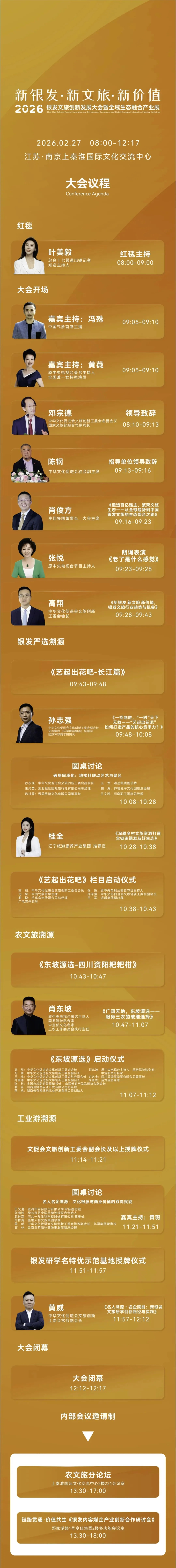2月27日上午,本次大会主论坛将正式开启,论坛汇聚600 + 银发产业先锋、100 + 权威媒体矩阵、100 + 头部旅行社、200 + 优质景区 / 酒店各界权威声音,紧扣“新银发・新文旅・新价值”大会主题,从政策解读、全域生态融合体系构建、全球视野下的银发健康挑战,到文旅创新赋能银发产业、生态实践落地等核心方向,全方位勾勒银发经济创新发展新蓝图。一场主论坛,3大溯源精彩篇章,多重思想激荡,为与会者提供前瞻性的战略思考和产业布局指引,助力打通银发文旅产业协同发展链路。