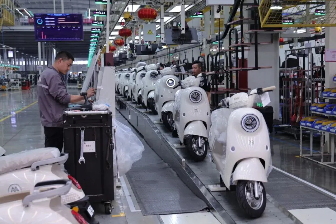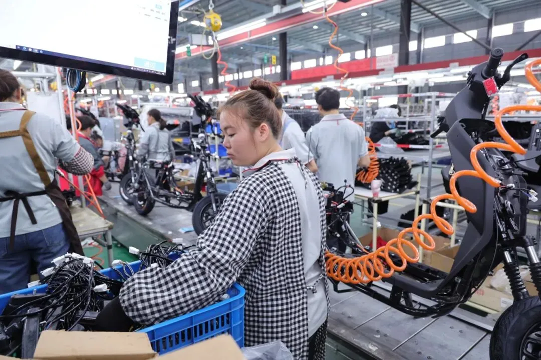 工人们熟练操作,一辆辆电动车接连下线