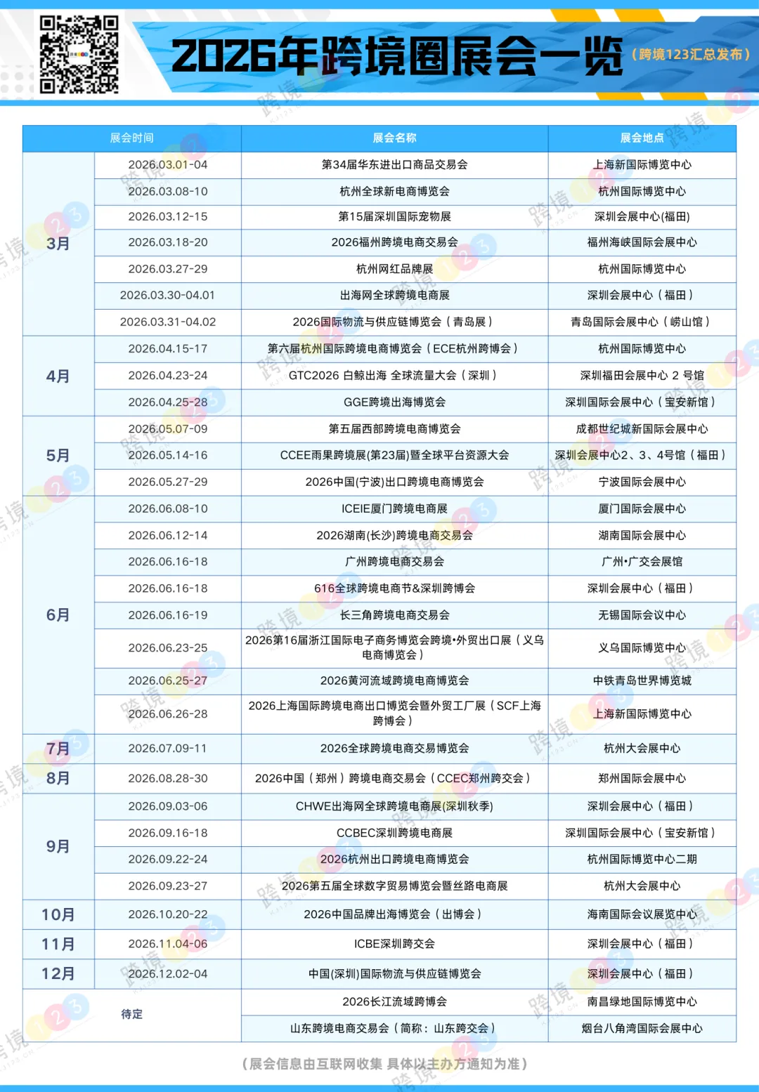 对于跨境人来说,把握行业风向标的第一步,就是锁定全年的展会排期。无论是选品对接、物流资源整合,还是洞察全球市场趋势,展会都是不可或缺的阵地。跨境123为大家整理了这份《2026年跨境圈展会一览》,涵盖深圳、杭州、广州、上海等外贸重镇的核心展会。建议收藏,提前规划2026年的行程!
