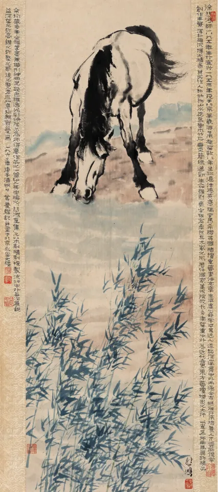 徐悲鸿 饮马图 设色纸本 106.5cm×35.5cm