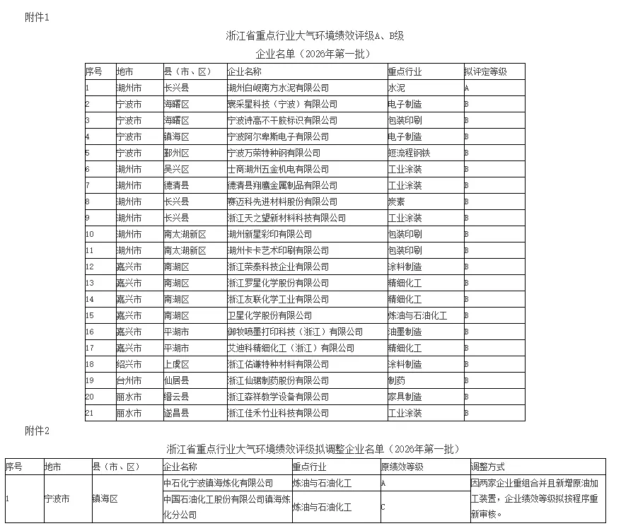 根据《浙江省空气质量持续改善行动计划》(浙政发〔2024〕11号)、《关于加强重点行业大气环境绩效分级管理的指导意见》(环办大气〔2026〕2号)等文件, 浙江省生态环境厅 组织各地开展重点行业大气环境绩效评级工作。经企业自评、市局初审和省厅复核,拟确定全省2026年第一批A级企业1家、B级企业20家,拟调整企业1家。现将名单予以公示。