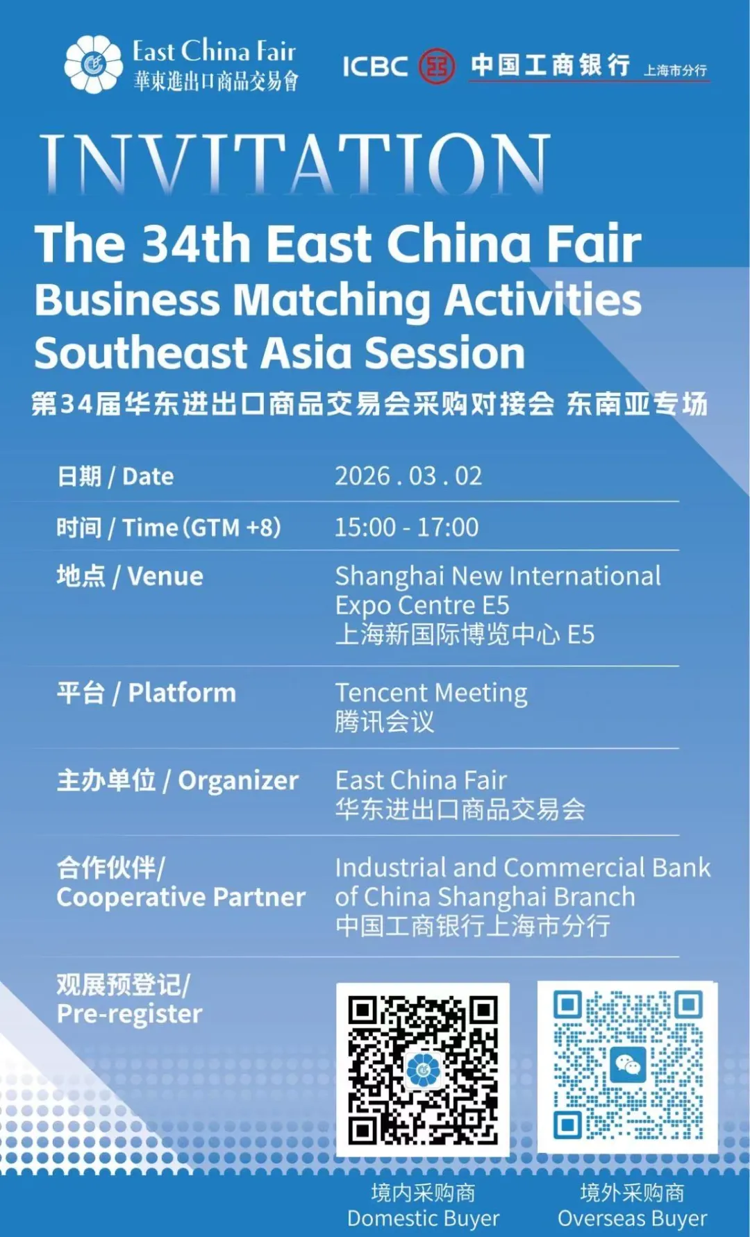 第34届华东进出口商品交易会(简称“华交会”)将于2026年3月1日至3月4日在上海新国际博览中心举办。作为华交会长期合作伙伴,工商银行上海市分行深入践行高水平对外开放和贸易强国战略,以高度的政治责任感和专业化服务,为上海、江苏、浙江、安徽、福建、江西、山东、南京、宁波9省市展客商提供全方位、多层次的金融服务支持,助力“中国制造”走向世界。