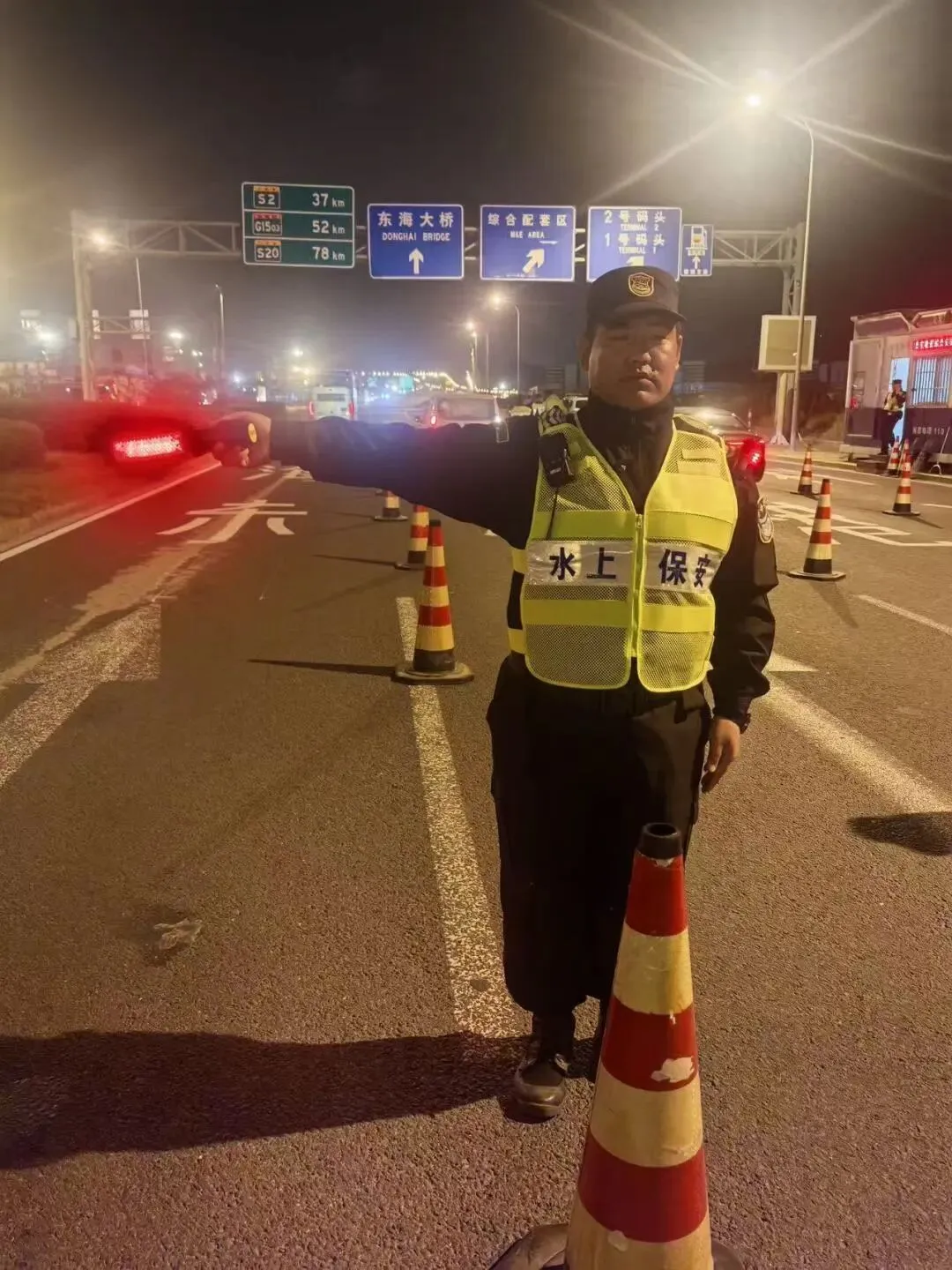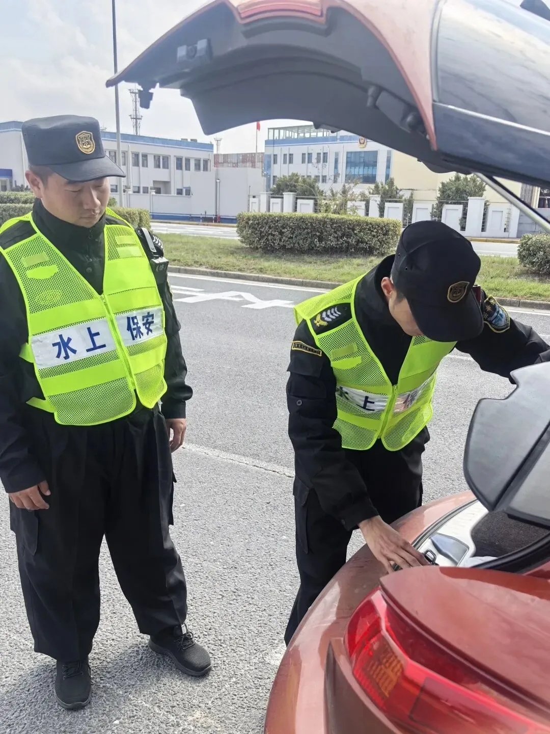公司统筹调配精锐力量,组建由资深管理人员与专业化保安团队构成的专项工作组,严格规范检查流程,运用车底扫描仪、安检设备等科技手段,强化对车厢底盘及隐蔽部位的精准排查,同时配合人力安保,对车辆后备箱、运送货物进行检查,确保逢车必检,保证安全隐患“零遗漏”。同时,依托与小洋山派出所的联勤联动机制,优化完善应急预案,提升突发事件协同处置效能,为安保任务提供坚实保障。