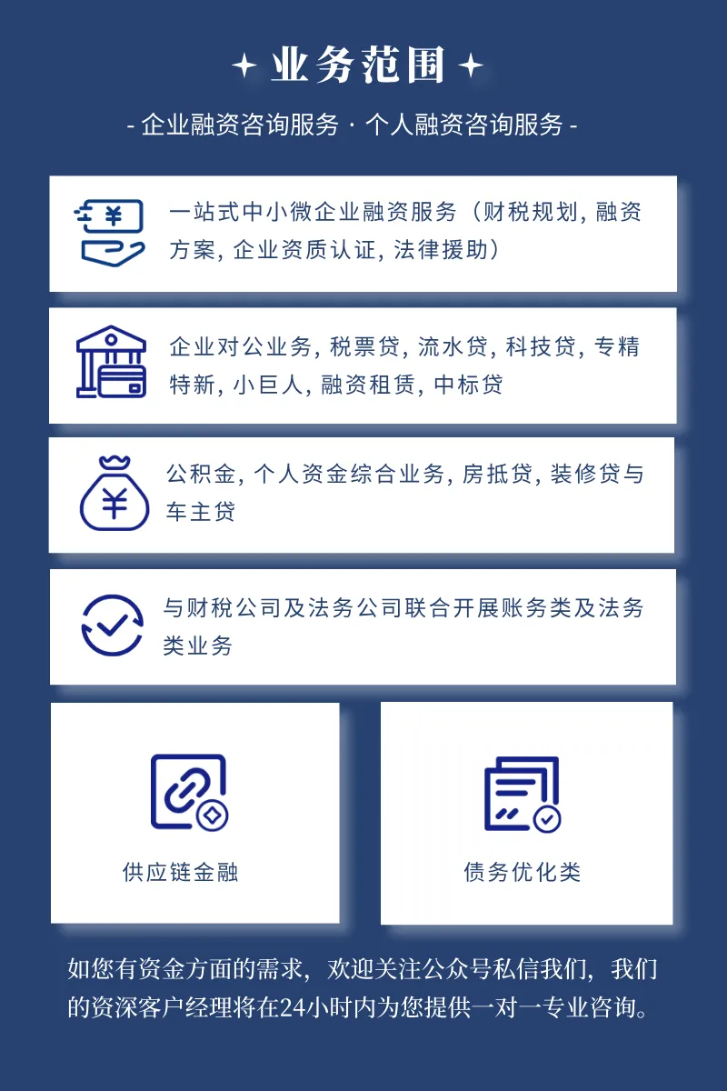 申请贷款,贷前综合评估自己的财务状况和信用记录至关重要,如有需要,可选择正规的融资咨询机构,根据企业实际需求匹配最优方案。我们提供免费咨询服务,助您规避风险、降低融资成本,提高融资成功率。