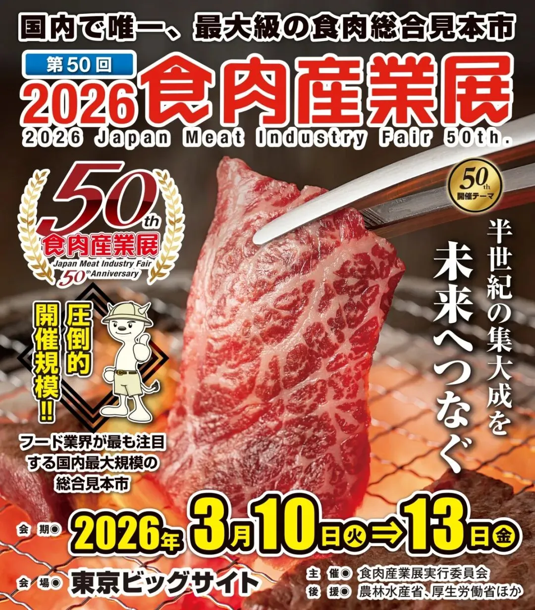 主催者:【食肉産業展実行委員会】(公財)日本食肉生産技術開発センター、(公財)日本食肉消費総合センター、(公財)日本食肉協議会、(一財)畜産環境整備機構、全国食肉事業協同組合連合会、(一社)日本食肉加工協会、日本ハム・ソーセージ工業協同組合、(公財)日本食肉流通センター、(株)食肉通信社(運営事務局)