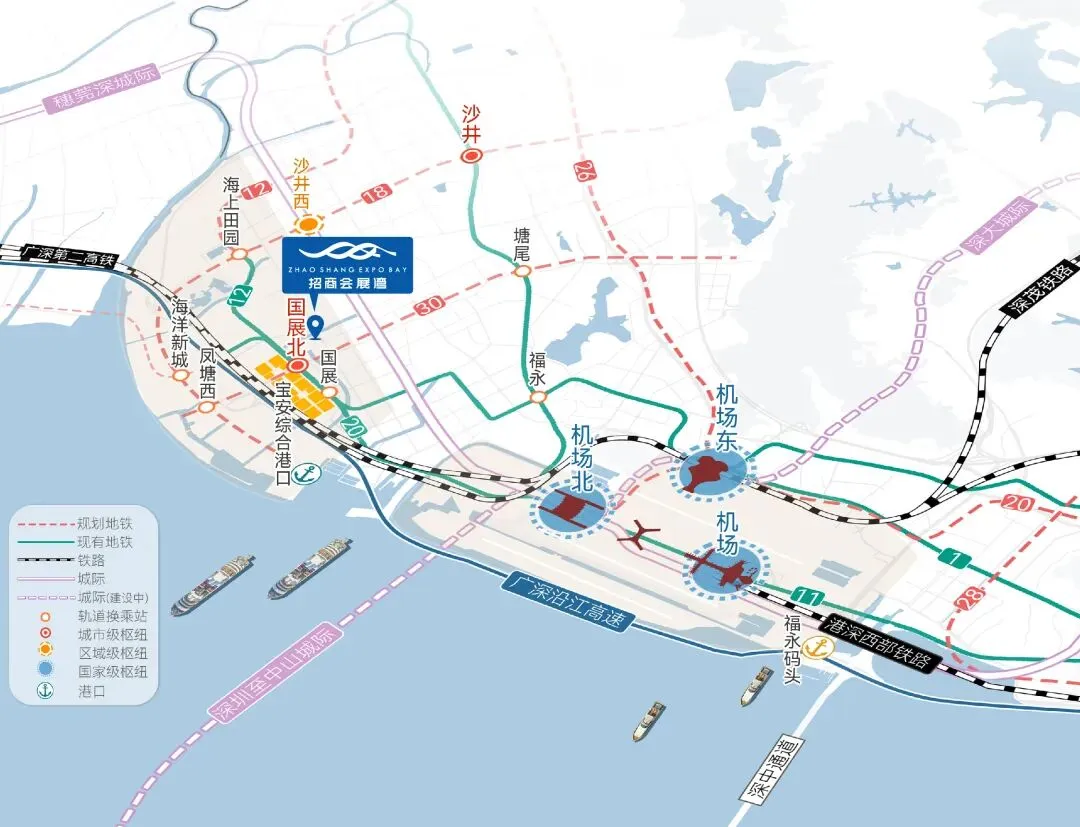 ?铁:步行约50米享国展、国展北站双地铁口,可接驳乘坐12/20/30号线(规划中)。约30分钟到宝中、40分钟到南山,不换乘直达蛇口?陆:距沿江高速入口仅1.5公里,东抵福田、南山,西达东莞、广州。经深中通道可直达中山、珠海✈空:驾车15分钟达宝安国际机场T3航站楼,直飞往全球超120个国家?轨:10分钟车程可达穗莞深城际福海西站,快速接驳大湾区?海:直线距离约12km达机场码头,通往港澳;直线距离约3.5km达海洋新城超级码头(在建)❏ 商业超配丨约32万㎡国际商业集群