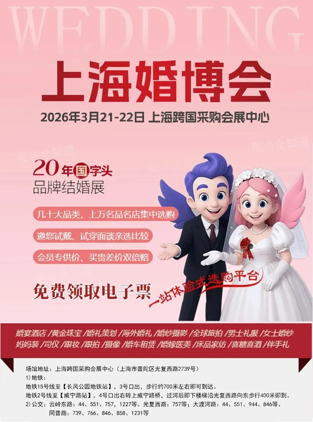 2026春季上海婚博会将于3月21-22日将于上海跨国采购会展中心(普陀区光复西路2739号)。现场涵盖婚纱照、婚宴酒店等全品类,2天亲临展会现场“货比三家”筹婚你需要的一切都能在此一站购全。现场挑选、谈单、订单一站式全搞定!!末文可获取近期上海展会开展信息~