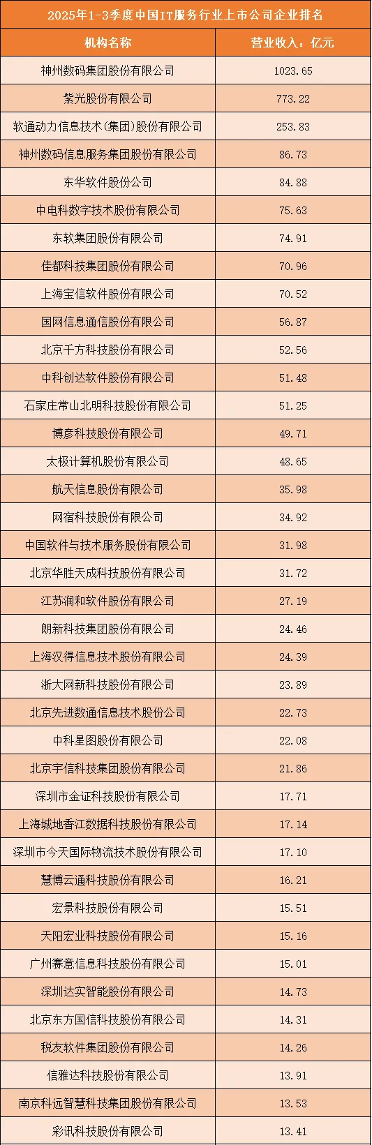 一、2025年1-3季度中国IT服务行业上市公司企业排名分析