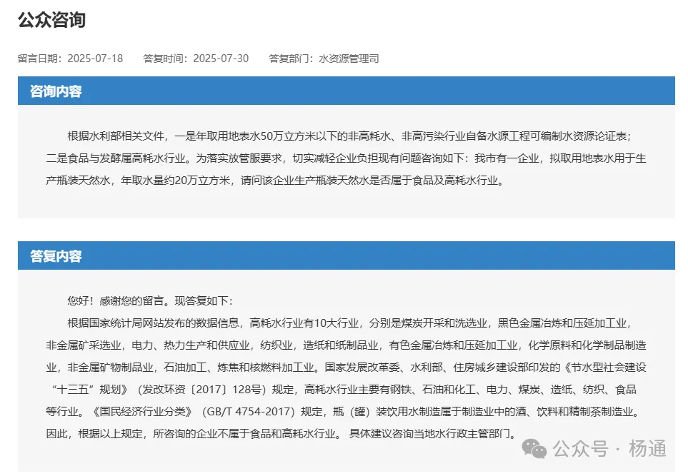 根据水利部相关文件,一是年取用地表水50万立方米以下的非高耗水、非高污染行业自备水源工程可编制水资源论证表;二是食品与发酵属高耗水行业。为落实放管服要求,切实减轻企业负担现有问题咨询如下:我市有一企业,拟取用地表水用于生产瓶装天然水,年取水量约20万立方米,请问该企业生产瓶装天然水是否属于食品及高耗水行业。