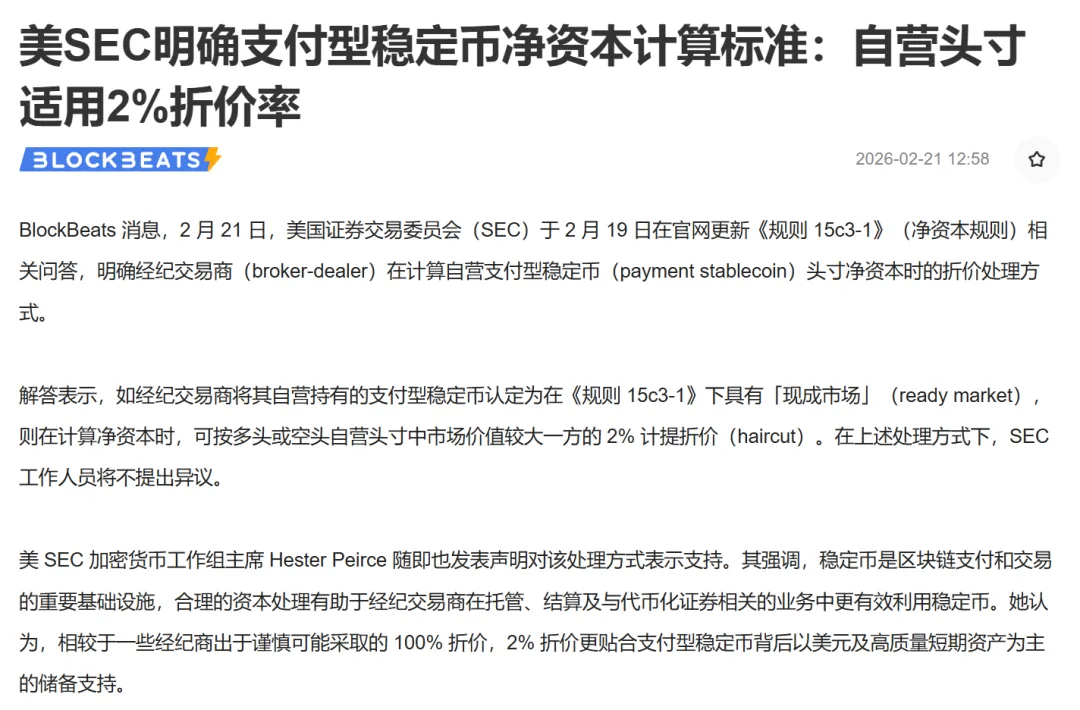政策铺垫: 近期,美国 SEC 明确了受监管券商在计算净资本时,对合规稳定币(如 USDC)适用 2% 的折价率(Haircut)。这一规定在财务合规层面显著降低了经纪商(如 Coinbase 及其清算方)持有和处理稳定币的资本占用成本,使 USDC 在传统券商体系内具备了“准现金等价物”的流动性效能。