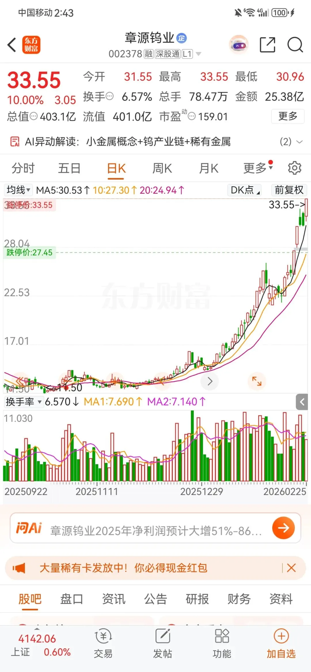 2026年2月以来,股价在25-33元区间高位震荡。2月11日,受黑钨精矿长单价格单月暴涨28%利好刺激,股价放量涨停,收盘价27.64元,总市值332亿元。2月25日,股价再次涨停,报收33.55元,总市值403.08亿元。