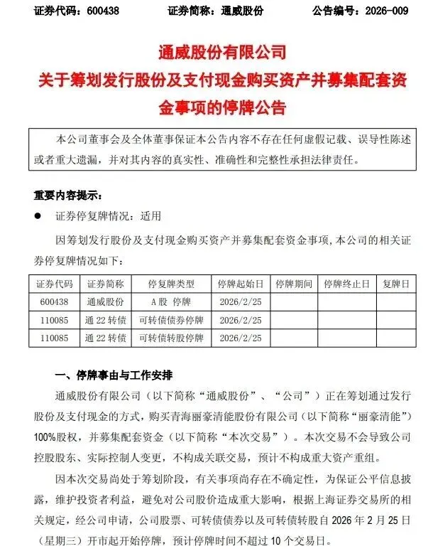 为保证公平信息披露,维护投资者利益,避免对公司股价造成重大影响,公司股票、可转债债券以及可转债转股自2026年2月25日起开始停牌,预计停牌时间不超过10个交易日。