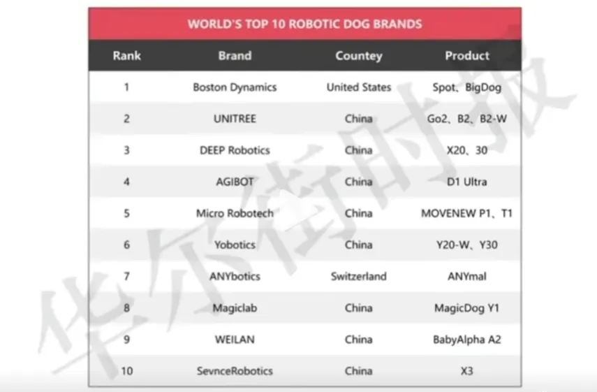 榜单显示,美国波士顿动力(Boston Dynamics)仍位居榜首,瑞士ANYbotics排名第七,其余八个席位由中国企业包办,包括:宇树科技(UNITREE)、云深处科技(DEEP Robotics)、智元机器人(AGIBOT)、具微科技(Micro Robotech)、优宝特(Yobotics)、魔法原子(Magiclab)、蔚蓝智能(WEILAN)与七腾机器人(SevnceRobotics),涵盖从消费级到工业级的全场景应用。