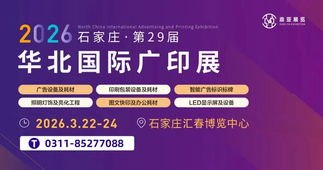 2026年3月22日-24日,由石家庄碧云天标识有限公司主办、河北鼎亚展览服务有限公司承办的第29届华北国际广印展在石家庄市汇春博物园汇春博览中心举办。本届展会将以更大规模、更高品质、更多创新,为行业搭建一个集技术交流、产品展示、贸易合作于一体的专业平台。诚邀广告、印刷、标识、包装、图文快印等相关行业人士莅临参观,共同见证行业发展,探寻合作商机!
