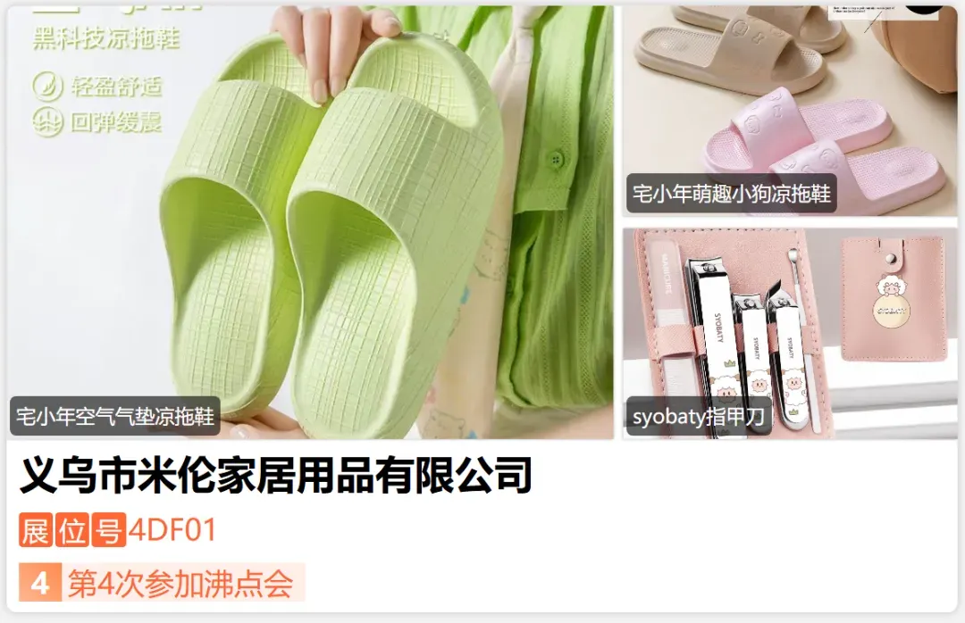 义乌市米伦家居用品有限公司主营中高端凉拖鞋,棉拖鞋,工厂直销,产能充足,优质服务团队,服务无忧,自有仓库备货发货,日发货量大,线上线下一件代发!Syobat主营中高端指甲刀套装,美妆工具,工厂直销,产能充足,优质服务团队,服务无忧,自有仓库备货发货,日发货量大,支持 线上线下一件代发。-展位号:4DJ01-