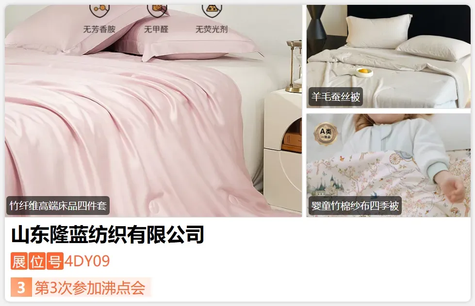山东隆蓝纺织有限公司从事家纺行业18年,主营家纺床上用品,婴童产品,竹纤维凉席、冰丝凉席、天丝苎麻凉席、夏凉被、枕头,盖毯,线上电商大牌指定合作工厂,线下直供各大商超,工厂拥有多条生产线,面料织造、染色、印花、裁剪、缝纫为一体的复合型工厂,可一件代发日发货量1W+,产品稳定,品质保证。-展位号:4DG07-