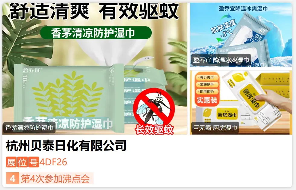 杭州贝泰日化有限公司 ,系一家生产无纺布美容用品和卫生用品20年的专业工厂,自公司成立日起,就是以外贸生产为主、国内知 名品牌OEM/ODM为辅的公司。贝泰日化通过了ISO9001认证外,还通过了INTERTEK(天祥ITS)的SQP全面质量管理体系认证和WCA社会责任的认证,还拥有消(字)号的卫生许可证,可以承接国内外客户的家用、车用、美容、卫生等范围的全部湿巾订单。-展位号:4DY15-