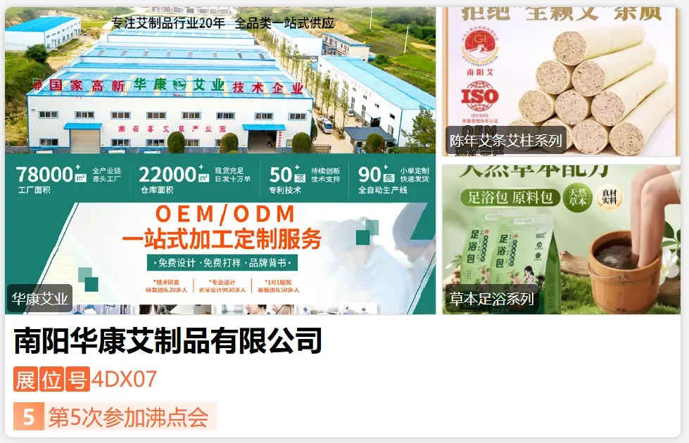 华康艾业是市场上前三的艾产品全品类供应链,国家高新技术企业、农业产业化省重点龙头企业、南阳市放心消费示范企业,专业提供艾绒艾条艾柱传统艾灸产品、泡脚沐浴类产品、中药香薰类产品、自发热贴类产品、艾灸器具类产品、艾草日化类产品批发制作。-展位号:4DB06-