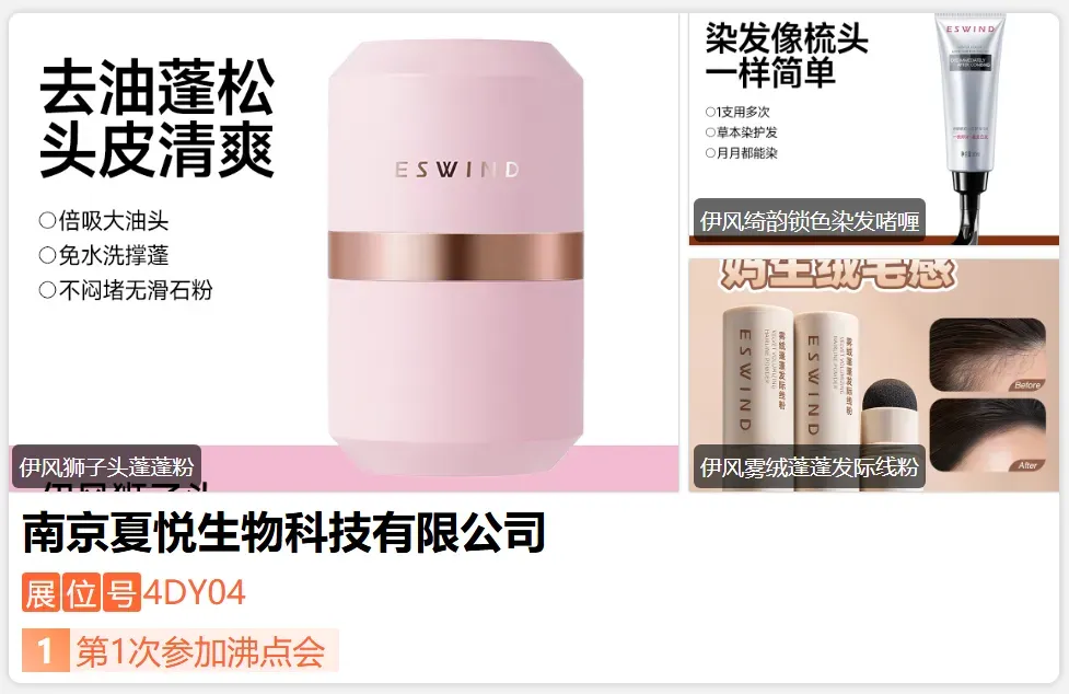 伊风(ESWIND)是中国洗护造型领域的头部品牌,创立于2014年,以差异化的产品策略聚焦头皮护理与头发蓬松细分赛道。主推产品:蓬蓬粉,染发啫喱,发彩笔,红润红养洗护系列;核心优势:蓬蓬粉全网热销超500万件,并蝉联天猫类目热卖榜;造型线发彩笔kkv,调色师热卖;洗护系列入驻线下各大商超。-展位号:4DH22-