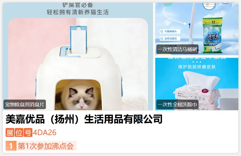 ☑为用户提供高品质的清洁清扫用品,提升生活和工作美嘉优品(扬州)生活用品有限公司:是一家专注于家庭用清洁清扫用品,设计、生产和销售的企业,总部位于江苏省扬州市广陵区。☑美嘉优品公司致力于为家庭和商业和客户提供高 效、环保的清扫,清洁解决方案,主要产品全棉洗脸巾,一次性可冲散马桶刷刷头、猫厕所用多功能除臭剂等产品。☑美嘉优品以“让清洁更简单、更环保”为使命,致力于环境的整洁与舒适。-展位号:4DK26-