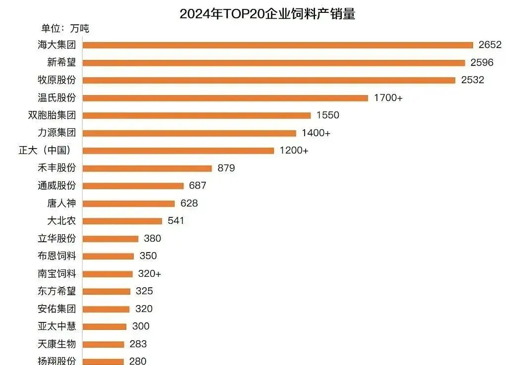先看一组数据:2024年全国工业饲料总产量迎来三年来首次下滑,但头部企业的产量却在持续攀升。海大集团以2652万吨登顶全球,新希望、牧原紧随其后,均突破2500万吨大关。