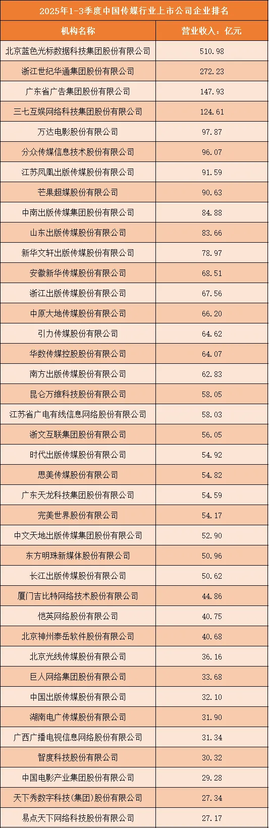 根据申万行业分类,2025年1-3季度中国传媒行业上市公司按营业收入排名如下:(A股上市公司)