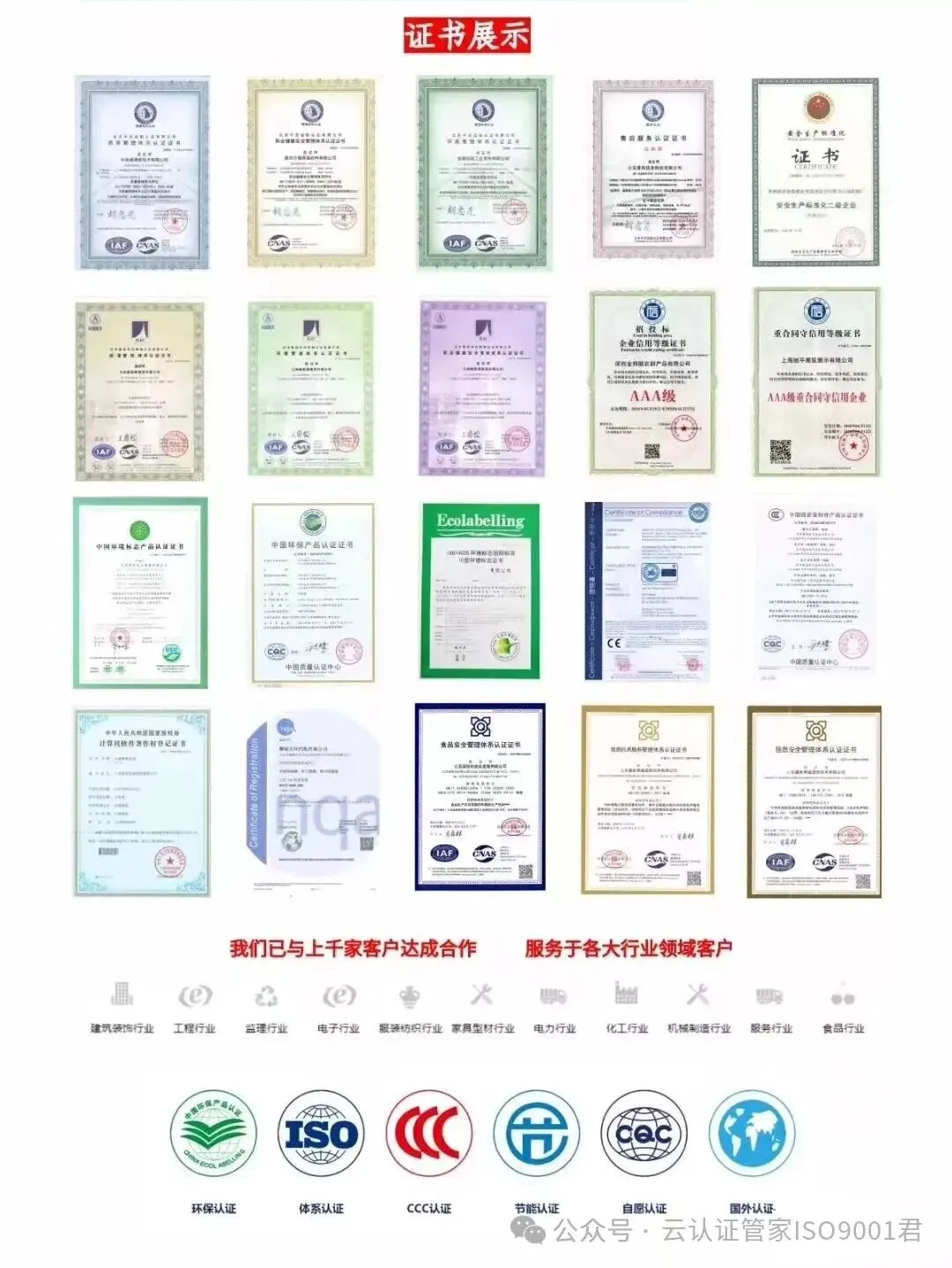 主要针对企业的质量管理。这是投标的首选,许多大客户要求企业必须具备这项认证。它展示了企业确保服务质量稳定,追求“零缺陷”的目标,体现了企业对客户负责的形象和责任。