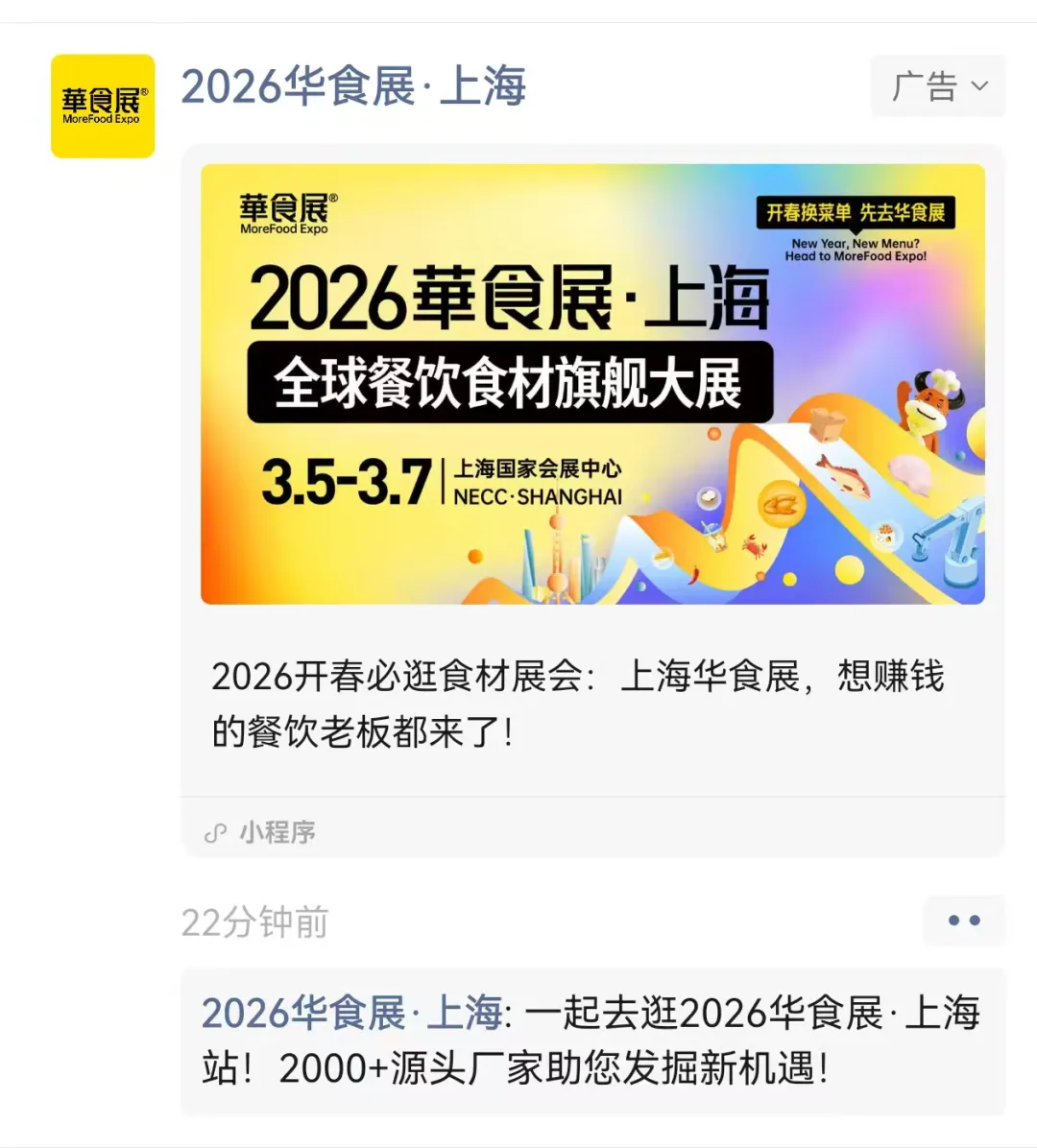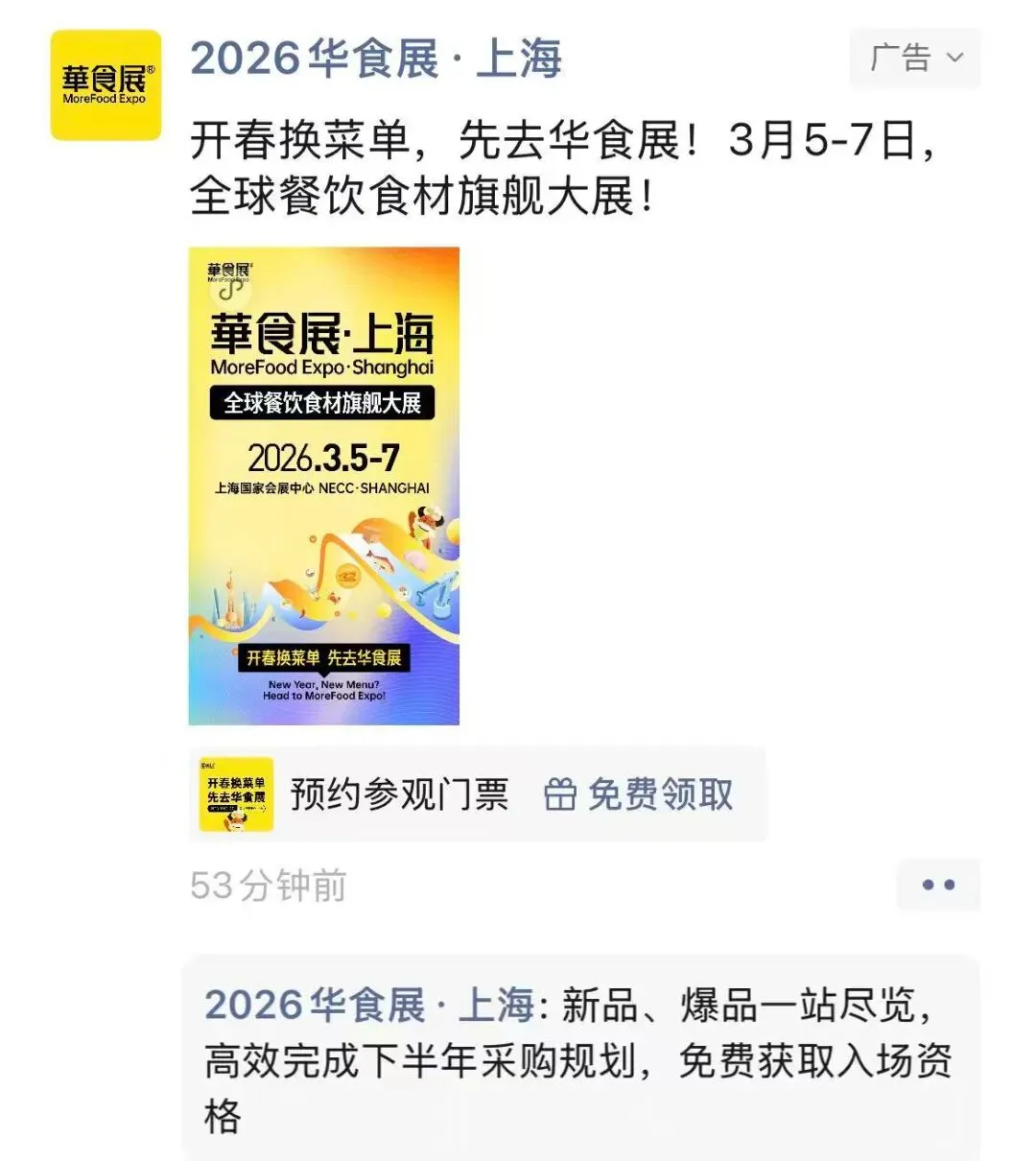开春换菜单,先去华食展!2026华食展·上海 将于2026年3月5日至7日在国家会展中心(上海)举行。华食展·上海将涵盖:预制菜及调理食品、水产、肉禽、调味品及米面粮油、火锅食材、冷冻食品、蔬果净菜、中央厨房加工设备、食品包装设备等餐饮食材全产业链产品。