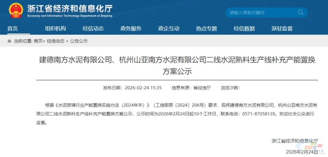 2月24日,浙江省经信厅发布“建德南方水泥有限公司、杭州山亚南方水泥有限公司二线水泥熟料生产线补充产能置换方案公示”。