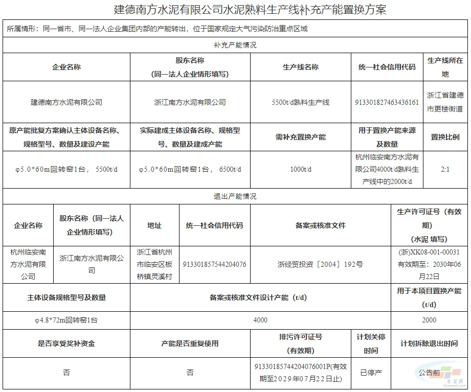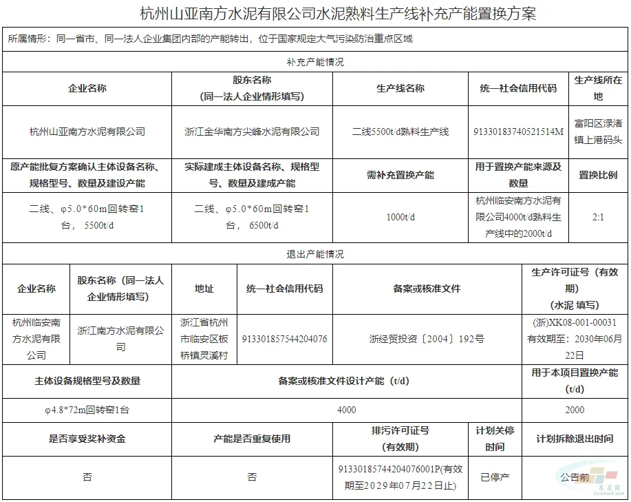 置换方案显示,杭州临安南方水泥退出一条4000t/d熟料生产线,其中2000t/d用于建德南方水泥补充一条5500t/d熟料线,补齐后产能6500t/d,置换比例2:1;另外2000t/d用于补充杭州山亚南方水泥一条5500t/d熟料线,补齐后产能6500t/d,置换比例2:1。