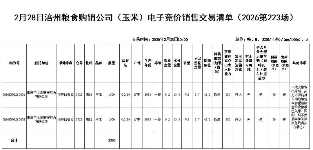 受重庆市涪州粮食购销有限公司委托,重庆市粮油批发市场有限责任公司(即国家粮食重庆交易中心,以下简称“批发市场公司”),定于2026年2月28日10:00举办涪州粮食购销公司(玉米)电子竞价销售交易会,现将有关事项公告如下: