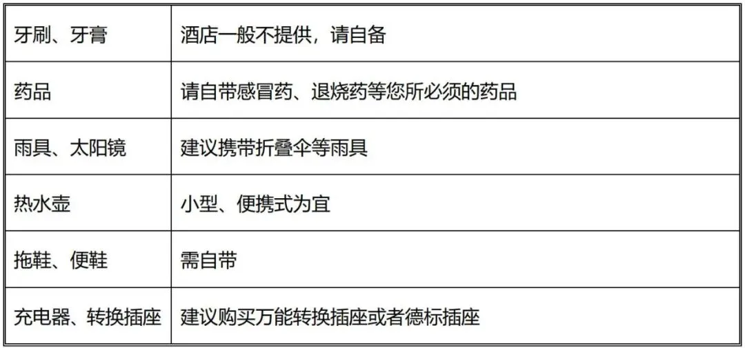 以下仅就一般需要列表,如果有特殊习惯之游客,请将您所需物品带上。