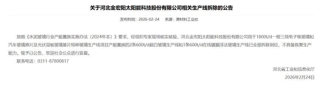 2月24日河北省工信厅发布了关于河北金宏阳太阳能科技股份有限公司相关生产线拆除的公告,通知显示河北金宏阳太阳能科技股份有限公司用于1800t/d一窑三线电子级玻璃和汽车玻璃原片及光伏背板玻璃基片特种玻璃生产线项目产能置换的2条600t/d超白玻璃生产线和1条600t/d在线镀膜浮法玻璃生产线已全部拆除到位,不具备恢复生产能力。