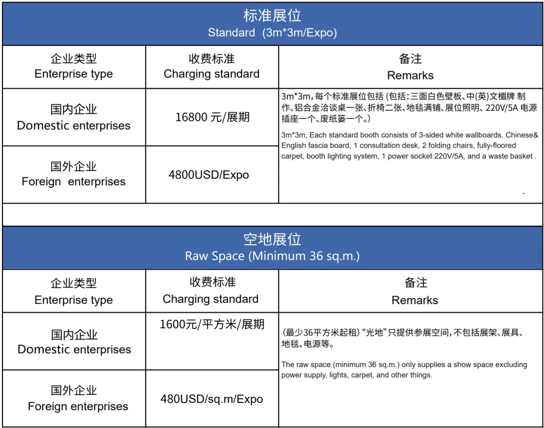 参展费用按企业性质(国内/国外)、展位类别(室内光地/标准展位)梯度定价,通过差异化收费满足不同企业的参展布局与成本需求。