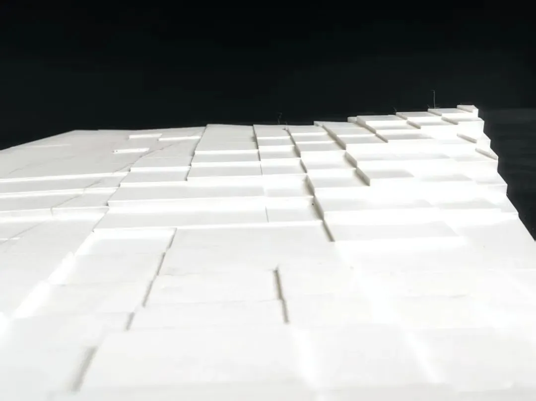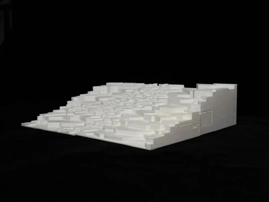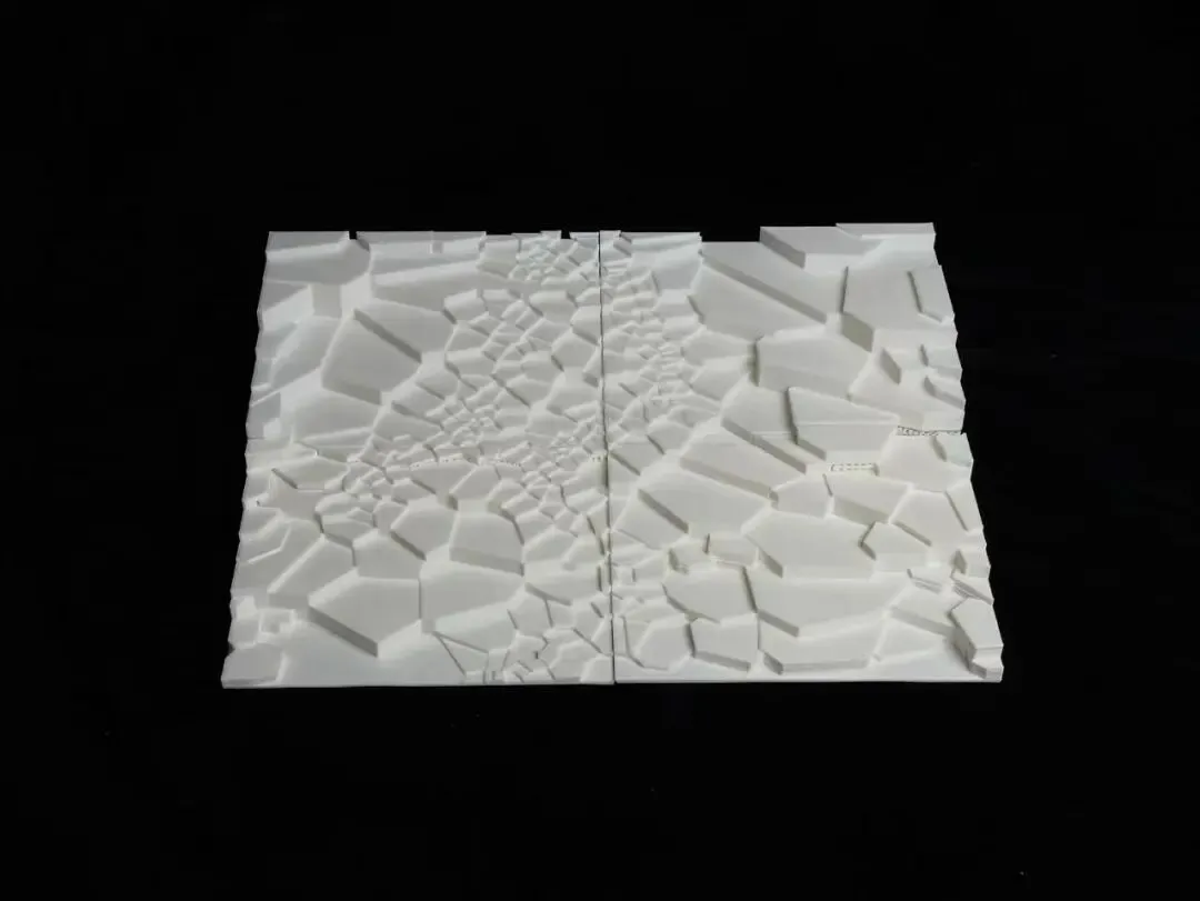 参数化深度设计中,我们基于岩松鼠岩石生境的长期观测,将其不同生命活动所需的差异化岩石形态抽象为泰森多边形;再结合场地本底地形数据与人群活动强度模拟,生成动态干扰曲线,以此对多边形的大小、高度进行精准扰动;最终将经自然习性与人类活动双重校准的抽象形态,重新映射至人类活动尺度,形成台阶、台地花园与台地树林有机交融的场地景观。建筑设计同样秉持在地性原则,深度依托场地原有地势起伏,以原创性景观建筑形态融入共生体系。