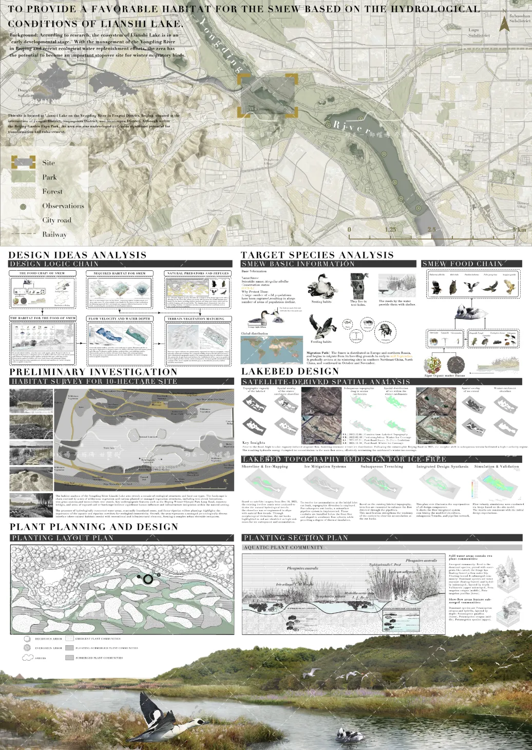 该作品以洪水破坏后的莲石湖为选址,选取白秋沙鸭为关键物种,通过扎实调研与系统分析,提出了一套以物种生态需求为核心、融合地形、植被与水文的生境修复策略。方案逻辑清晰,图纸表达美观,体现了生态设计的科学性与综合性,并积极探索了生态保护与观鸟经济相结合的可持续路径,展现出良好的研究深度与实践价值。