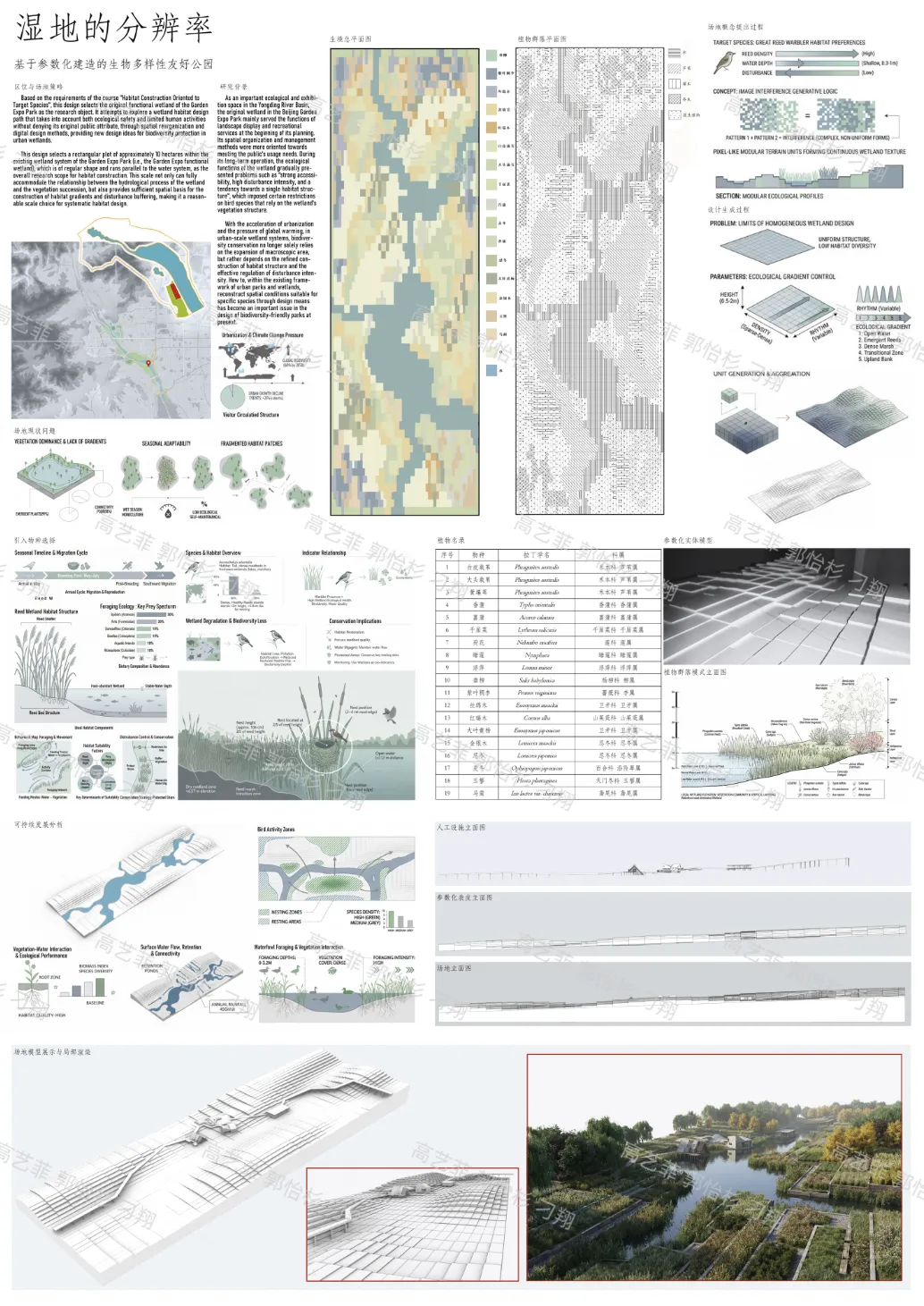本设计以北京市园博园原功能湿地为研究对象,在生物多样性友好公园的框架下,选取对生境结构高度敏感的东方大苇莺作为目标物种,通过参数化与“图像干扰”方法探索城市湿地中生境精细化营建的可能路径。
