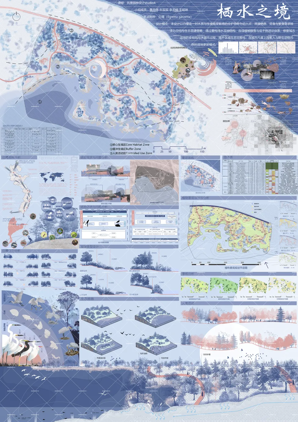 设计场地位于北京市丰台区园博园锦绣谷区域,立足于场地原有湿地的条件,以白鹭这一对水质与生境高度敏感的伞护物种为切入点,将其栖息、觅食与繁育需求转译为空间与生态营建策略。通过重构浅水湿地结构、连续植被群落与低干扰活动体系,修复城市湿地的食物网与水循环过程,进而提升区域生态完整性,在城市尺度上探索人与野生动物共存的湿地更新模式,打造一个人鸟共栖的空间。